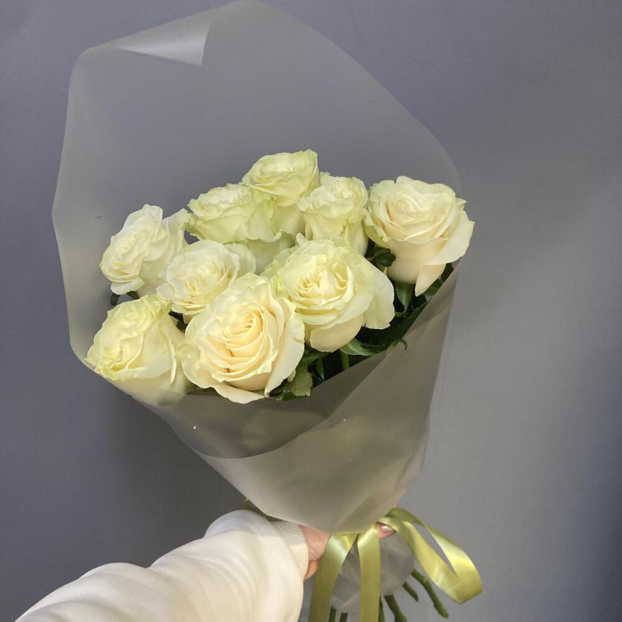 На фото букет из 9 белых роз. В составе: роза 9 шт, дизайнерская упаковка 1 шт, атласная лента 1 шт, . Все цветы свежие и ароматные, букет красиво оформлен и отлично подходит для подарка. Доступна доставка цветов или самовывоз.